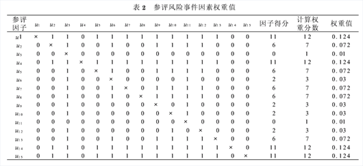 3.2用模糊综合评价法对风险事件后果排序 模糊综合评价法(FuzzyComprehensiveEvaluation,简称FCE),可以分为单因素模糊评价和多层次模糊评价,这里只介绍单因素的模糊评价方法,其评价过程如下. a.确定因素集.因素集为各种风险因素的集合,即U={u1,u2,…,un}. b. 给定各因素的权重.由于评价指标体系具有明显的层次性,可采用层次分析法或由专家确定各指标层的权重,一般用权重向量A={a1,a2, …,an}表示. c.建立评价等级集.评价等级集是评价者对评价对象可能做出的各种评价结果所组成的集合,即V=(V1,V2,…,Vn).这里,由十位专家组成评价小组,评价等级分为5级,即V={很好,好,一般,差,很差}.d.确定隶属关系,建立模糊评价矩阵.从U到V的一个模糊映射,可以确定一个模糊关系R,它可表示为 R={rij|i=1,2,…n;j=1,2,…,m},(1) 式中,rij为隶属度,即第i个指标隶属于第j个评价等级的程度. e.进行模糊矩阵的运算,得到模糊综合评价结果为B=A·R. 用模糊综合评价法对长江隧道工程施工风险进行评价时,具体计算过程如下. a.确定风险事件集和后果评语集两个论域.前面已经找出了长江隧道工程施工阶段的15种主要风险,将这些风险事件构成集合,就形成风险事件因素集U={u1,u2,…,u15}.评价风险事件产生的后果,一般分成五种情况,这五种情况就构成了长江隧道工程风险事件的后果评语集V={灾难性(v1),重大(v2),严重(v3),中等(v4),轻微(v5)}. b.确定参评风险事件因素权重值.参评风险事件因素权重值的确定,就是确定风险事件因素的权重向量距阵A.本文主要采用0-1评分累计法,即经过专家对每个风险事件评分后,取其平均值,求得各参评因素权重值(表2),则参评风险事件因素的权重向量为A={a1,a2,…,a15}={0.124,0.072,0.01,0.124,0.072,0.03,0.072,0.072,0.03,0.03,0.01,0.03,0.072,0.124,0.124}.