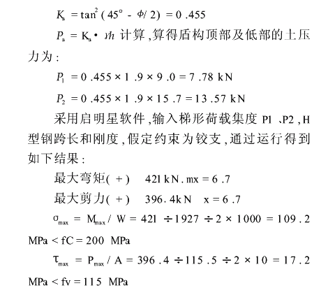 4井外土体加固工作 软土地层盾构出洞施工前的井外土体加固通常可以采用深层搅拌桩、SMW桩或冻结法进行施工。本工程的两个始发井分别位于虹口足球场站和曲阳路站,虹口足球场站地下2.0m以下分别为粉土层和粘土层,曲阳路站在地下16m范围基本为砂质粉土层,这样的土层自身缺少自立性和防水性,一旦有较大的临空面时,土体就可能产生大量滑坡、坍塌、涌水和涌沙现象。综合考虑地质情况、施工场地条件、施工工期和工程造价,决定在虹口足球场站始发井外采取深层搅拌桩结合注浆加固;在曲阳路站始发井外采取SMW桩结合旋喷加固(在距端头井4m位置有二根上水管,深层搅拌桩加固范围不够)。注浆和旋喷加固的主要作用是使搅拌桩或SMW桩与井壁外侧形成的加固盲区得已补充,使得加固区形成一个整体,避免开洞门时漏浆。本文主要介绍SMW工法出洞加固施工。4.1SMW桩加固区的选定 型钢采用500×200×10×16窄翼缘型钢,搅拌桩采用700直径。型钢每孔插入一根。插入深度18m。其平面布置见图2。4.2加固体中型钢的强度和变形检算型钢W=1927cm3,A=115.5cm2加固后土体按:γ=1.9kN m3,?=22°