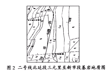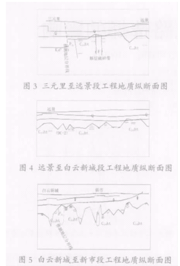 三元里至新市段原始地貌形态属广花凹陷冲积盆地,第四系地层以冲洪积砂层、土层及残坡积堆积为主,基岩地层为石炭系中上统壶天群石灰岩和二迭系下统栖霞组炭质灰岩,岩层层面高低起伏,岩溶溶洞、土洞(本文统称为岩溶洞穴)十分发育,工程地质条件复杂,对本段土建工程设计和施工的安全性以及对地面交通运营、建(构)筑物的安全保障提出了很高的要求。2工程地质条件2.1区域地质 对照广州市基岩地质图(图2),三元里至新市段位于广从断裂以西,新市-嘉禾断裂组以东区域,南端在三远区间与东西向的三元里断裂近垂直相交。线路出三元里过一小段二迭系下统栖霞组炭质灰岩后,即进入壶天群灰岩分布范围。从图中可以看出,远景站前后区间线路与栖霞组灰岩和壶天群灰岩的岩性分界线几近重叠,在白云新城站后局部经过栖霞组炭质灰岩。