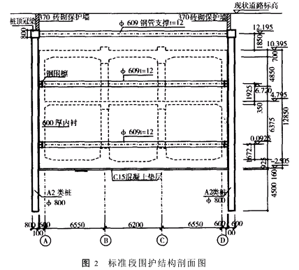 1 .2 结构概况 本工程为明挖顺作的地下二层岛式车站,基坑长170 4m,宽21 7m,深16 2~18 2m。车站主体结构采用两层三跨现浇钢筋混凝土闭合式框架结构。车站主体及双层风道围护结构采用ф800钻孔灌注间排桩,桩距为1 6m;其余单层风道及通道的围护结构采用ф600钻孔灌注间隔排桩,桩距1 2m; 桩间采用钢丝网喷混凝土护面。支撑采用ф609钢支撑,盾构井基坑设置4道横向水平支撑,车站主体标准段设置3道横向水平支撑(见图2)。