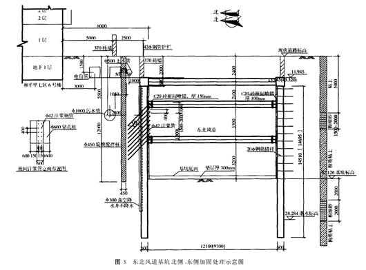 附属工程施工期间及道路倒边后,东西向行驶的车辆可通过在紧邻和平里北街北侧的车站上铺设的20m宽的临时道路通行,维持既有14m宽双向四车道通行能力,同时还保证有6m宽的非机动车道及人行道。横跨和平里北街的通道采用暗挖法施工,地面交通将不受影响。南北向的和平里西街同道路倒边前,维持既有两车道通行能力。在施工跨越和平里西街的西北出入口人防段时,将和平里西街部分道路临时改移到主体结构上,也能保证既有的通行能力。 总之,交通疏解按方案二实施后,车站施工期间的东西、南北向交通都畅通无阻,也省时省事,还节约投资成本,而且主体结构的施工也能保证了其连续性、安全性。2.2 民族楼6号楼边上东北风道基坑的加固处理 东北风道基坑边上的民族楼6号楼,是建于50年代的住宅楼,已鉴定为危楼。但在北京地铁五号线施工期间,民族楼6号楼不撤除,故必须对房屋进行保护,对风道基坑进行加固,以保证民族楼的绝对安全。2.2 1 东北风道周边建筑物调查、管线调查及相对关系 东北风道紧贴民族楼6号楼,相对位置为平行布置,平行长30 8m,基坑北侧边缘距民族楼阳台仅7 5m,中间存在有一条?500自来水钢管,一条?1000混凝土污水管,2条电信光缆。东北风道和附近建筑物、地下管线的相对关系(见图4)。2.2 2 民族楼6号楼的保护措施 根据和平里北街站车站主体的开挖及结构施工时引起的地表沉降分析,为保证现有状况的民族楼6号楼安全,把6号楼沉降控制到最小,不大于12mm,其预警值为70%。采取以下施工措施:(1)施作止水围幕。在东北风道基坑东侧和北侧即东北风道基坑与民族楼6号楼之间靠近基坑围护桩外侧施做单排?450@300旋喷搅拌桩,以形成一道止水帷幕,防止地层失水造成沉降。 (2)在土方开挖前20天对东北风道基坑南侧采用轻型井点进行降水,北侧不降水。