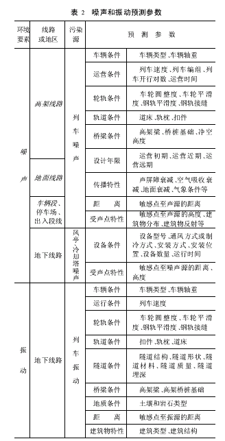 6)特点 被列入评价范畴的环境保护目标应按环境要素给出以下信息:保护目标的名称、线路形式、站间区段、里程位置、与声(振)源的平面及空间的相对位置关系(方向、距离、埋深、高差)、建筑物类型、功能、楼层、数量、建设年代、受影响的人数、所属环境功能区域、执行标准以及污染源类型(噪声源、振动源),等等。2源强类比的准确性2.1噪声与振动源强 轨道交通噪声和振动影响预测是声环境影响评价专题以及振动环境影响评价专题的重要内容,而轨道交通噪声和振动源强的确定是轨道交通噪声和振动影响预测的关键。其中需考虑的源强有:列车运行噪声(车辆设备噪声、轮轨噪声、桥梁结构辐射噪声)、风亭和冷却塔噪声、车辆段作业噪声等其他可能对环境产生影响的噪声源,以及列车运行振动、隧道结构和桥梁结构的辐射振动等。2.2噪声与振动源强的确定 噪声与振动源强的确定一般通过两种途径,即类比测量法和资料类比法。类比测量法即选择与新建项目类型和编组相同的车辆(设备),并在运行工况、线路形式、轨道结构以及环境条件相似的情况下,对列车(设备)运行噪声进行类比测量,并根据类比条件的差异进行必要的声学修正;资料类比法也称数据调查法,即引用车辆(设备)类型、运行工况、线路形式、轨道结构以及环境状况相似条件下的既有噪声源或振动源的测量数据。 选择何种方法确定源强,取决于评价等级的要求。对于一级评价等级的评价专题,必须采用类比测量法;评价等级为二级或二级以下的评价专题,可采用资料类比法。 在进行类比实测时,关键的要求是测量对象、测量参数、测量方法、测量的量以及测量环境等边界条件的一致性,即既有车辆(设备)类型与新建项目车辆(设备)类型、运行工况、线路形式、轨道结构,以及环境条件在尽可能相似的情况下,按照有关测量标准规定的测量方法,对既有列车(设备)噪声进行类比测量。 引用已有的测量数据同样要求在测量对象、测量参数、测量方法、测量的量以及测量环境等边界条件相似的情况下,对源强数据进行类比引用,并对测量条件进行说明。类比引用应说明资料数据的来源,应为公开发表并经专家鉴定的数据。3预测参数的适用性3.1噪声和振动预测参数 为减小预测结果的误差,需要根据既有源强与类比源强边界条件的差异,对既有源强的类比测量数据进行必要的声学修正,以使类比源强的准确度更高。此外,还要考虑传播途径和受声(振)点的特性,以便对受声(振)点的噪声和振动影响进行预测。 受声(振)点的噪声和振动影响与声(振)源、传播途径和受声(振)点的特性有关。噪声和振动预测参数包括声(振)源、传播途径和受声(振)点的特性参数。不同线路形式产生不同的环境影响,而不同环境影响又与线路、轨道、桥梁、隧道、轮轨、车辆、设备、运营组织、开行计划以及敏感点与声(振)源的相对位置关系等各种工程条件有关。 地上线路包括高架线、地面线、出入段线及车辆段或停车场,对环境保护目标的噪声影响主要是列车行驶过程中所产生的,并且受到车辆、运营、轮轨、轨道、桥梁、行车组织,以及敏感点与声源的相对位置关系等因素的影响;地下线路对地面建筑物的噪声影响主要是风亭、冷却塔等设备设施所产生的噪声,并且受到设备及其运行与安装方式、安装位置、设备数量、运行时间、敏感点至噪声源的距离、高度等因素的影响。噪声预测参数见表2。