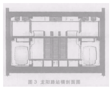 目前在国内不少城市正在尝试着把中庭的设计理念运用到地下车站的建筑空间设计中。3中庭式地下车站设计实例3.1上海市轨道交通7号线龙阳路站 上海市轨道交通7号线龙阳路站位于芳甸路东侧、花木路南侧的上海新国际博览中心停车场内,站本体公共区位于其交通集散广场下,为7号线终点站。这是上海市第一个已完成设计工作的地下中庭车站,并已开工建设。 车站形式为地下二层站前折返岛式车站。车站长度为354.8m,宽18.6m,整个地下空间呈长条形。在基于对乘客的乘车行为调研和分析的基础上,将站厅层中部乘客极少停留和穿越区域的部分楼板取消,形成两层挑空的共享空间,即形成公共区为两个长45m、36m,宽8m的双拼中庭空间。站立于中庭,不仅站厅层的乘客可以看清站台层的候车情况和列车进出站的情况,而且站台层的乘客也可享受到宽敞、明亮的候车区大空间。 这个设计理念经过几轮专家讨论,又进行了一些修改及优化。 1)立柱与屏蔽门结合设置,如图3所示。