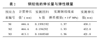 根据第一次张拉结果,经回归可得三跨连续箱梁K=0 .00369,μ=0 .0513。从表1中还可以看出,管道摩擦阻力随重复张拉次数的增加变化不大。(2)预应力钢绞线束弹性模量和伸长值:钢绞线束伸长值ΔL可由积分求得,其计算式为: ΔL=P1×L(1-e-(μθ+KL)) /(μθ+KL)EyAy(1)式中ΔL应是扣除管道长度外的钢绞线束伸长值和两端夹片回缩值后的理论伸长值。另外根据张拉端拉力与实际伸长值的回归可得: ΔL=b×P1(2)式中:b—实测伸长的回归值。 联立(1)、(2)式可得: Ey=L(1-e-(μθ+KL)/(μθ+KL)bAy钢绞线束弹性模量和伸长值计算结果列于表2。