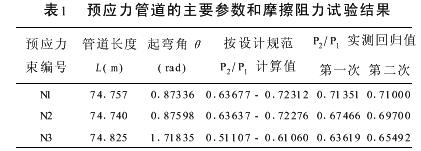 试验中采用一端张拉,12-Φ15预应力钢绞线从220KN拉力开始,分8级张拉至接近设计吨位1900kN。对于每个管道中的预应力钢绞线张拉伸长直,测量时主要读取下列内容:张拉端与固定端测力传感器读数、张拉端千斤顶油缸伸长量、张拉端与固定端夹片回缩量。 试验中可以在预应力束张拉前分别在其固定端和张拉端安装压力传感器,分级测试预应力束在张拉过程中固定端和张拉端的荷载(两个循环),并利用线性回归确定管道固定端和张拉端的荷载比值。由此可确定预应力钢筋应力及管道摩阻系数,由于管道摩阻而产生的预应力损失等。在测量中同时测出预应力钢绞线束的伸长量,可以测量预应力束的弹性模量。2.2 试验结果与分析 (1)管道摩阻:管道摩阻力由管道曲率效应和偏差效应两部分组成,管道摩阻可按下面的理论计算公式计算: P2=P1×e-(μθ+KL)式中:P1、P2—分别为张拉端和固定端管道口钢绞线束拉力; L、θ—分别为管道总长度(m)和管道总弯起角(rad); K、μ—分别为管道偏差系数和钢绞线束与管道壁之间摩擦系数。 P1、P2可由传感器测出,L、θ按设计值取用,因此按二元线性回归即可求得K和μ,3束管道长度、管道弯起角、P2 /P1设计值和实测回归P2 /P1列表1。