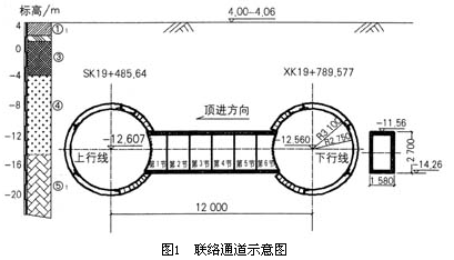 根据工程地质资料可知,联络通道处的主要土层从上到下分别是①1层杂填土、②层粉质粘土、③层淤泥质粉质粘土、④层淤泥质粘土和⑤1层粘土。