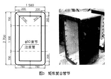 联络通道由6节宽1.58 m、高2.7 m、壁厚为0.2 m的预制复合管节组成,其中2节长1.2 m,为进出洞复合管节,4节标准复合管节长1.5m。复合管节由钢壳和内衬混凝土组成,钢壳背板涂2度环氧沥青漆,内衬混凝土等级为C30,抗渗强度为0.8MPa,混凝土保护层厚2.5 mm,平整度和密实度符合设计规定,并预留压浆孔(见图3)。