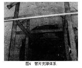 联络通道施工前,应在隧道内设置型钢支撑,形成柱状钢支撑,支撑联络通道口两侧的10环混凝土管片;在钢支撑上(沿隧道纵向)设置钢桁架梁,支撑点设在开口环上,开口位置上的支撑点处,必须填充混凝土。为了给钢支撑施加预应力,在各钢支撑顶端设液压千斤顶,采用三角形垫块与混凝土管片密贴(见图4)。
