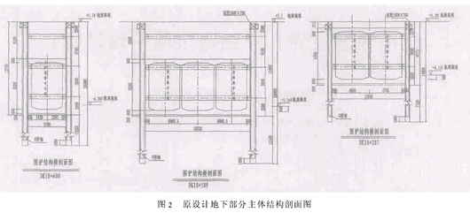 3 设计优化原因 本工程区间地下线部分,开挖深度相对较浅,最深处也只有12.8m,地层为砂性粘土和粉质粘土, 同时基坑开挖深度2倍范围内无高层、重要建筑物,并且地基进行了双液注浆加固,与上海其他地铁基坑同类围护结构相对具有可优化性,同时通过受力计算,完全满足安全要求。 (1)安全分析:DK18+631.239~509上、下行线路间土体较薄,最窄处为3.48m,最宽处为7.9m,且基坑最深处为12.8m,如上、下行同时施工,基坑开挖和支撑架设时土体内力的支撑预应力变化复杂,同时支撑加力不对称,中隔土体受力不均匀,产生偏压,造成中隔土墙不稳定,出现中隔土体破坏,造成严重的安全隐患;如上下线分开施工,在后序施工的线路土方开挖过程中,形成的纵向土体位移不均匀,使已施工的相邻结构受力和结构位移不均匀,造成已施工成型的结构开裂、破坏,为确保施工安全,避免结构位置发生偏移,取消上、下行线间的中隔土体,将上、下线基坑合为一个基坑,同时开挖。 (2)工期分析:通过围护结构的优化,在保证安全的前提下,搅拌桩数量减少、搅拌桩日施工进度明显加快,由8m·d-1提高至12m·d-1,同时通过将第二道支撑提至顶板上20cm,避免换撑,缩短了原设计中的边墙养护时间,加快了施工进度。 (3)环境分析:在DK18+631.239~+377段区间两侧无高层、重要建筑物,附近无地下管线,围护结构优化后,周边环境不会受到影响。 (4)费用分析:本优化方案H型钢节约费用约410万元,围檩、支撑及结构增加费用约250万元,综合节约工程费用约160万元。 4优化方案 (1)DK18+631.239~+509上、下行线路间劲性水泥搅拌桩及深层水泥搅拌桩取消,上下行线路间土体与上、下行线一起整体开挖,坑底进行抽条地基加固,支撑钢管(?609—16)加长对撑;DK18+631.239~+509段上、下线主体结构顶板采用横梁结构连接,横梁净距为2m/道,宽1m,厚度与顶板相同。具体形式见图3、4。 (2)原设计:DK18+631.239~+438.1采用Φ850劲性水泥搅拌桩,每孔插700×300×14×20型钢围护。优化为:DK18+631.239~+571.239采用Φ850桩,隔一孔插两根700×300×13×24型钢围护;DK18+571.239~438.1采用Φ850劲性水泥搅拌桩,隔孔插700×300×13×24型钢围护,DK18+438.1~DK18+377Φ650劲性水泥搅拌桩每孔插500×300×14×20型钢围护,优化为?650劲性水泥搅拌桩隔孔插500×300×11×18型钢围护。 (3)将DK18+631.239~DK18+438.1段圈梁高程由原高度降至地面下2m;将DK18+438.1~DK18+377冠梁高程由原高度降至地面下1m,型钢顶面高程同圈梁高程一致,地面需进行放坡,坡面采用土钉砂浆防护,DK18+631.239~+377段第一道支撑改设在圈梁上,第二道支撑设在主体结构的顶板上20cm处。 优化后施工图见图3~5。5 结束语 通过设计优化节约工程成本,降低了施工难度,加快了施工进度;通过现场施工发现优化中未充分考虑上海地下水位较高这一特点,导致冠梁与SMW工法接口处局部有渗水现象。
