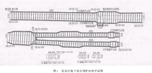 上海轨道交通9号线基坑围护设计优化摘 要 本文主要介绍了上海轨道交通9号线泗九区间SMW工法围护结构的设计优化,通过优化缩短了工期,减少了工程造价,降低了施工难度。为同类工程施工提供了经验。关键词 围护结构 设计优化1工程概况 上海轨道交通9号线泗九区间全长658.986m,共有地下及地上两部分组成,其中地下部分344.239m,起讫里程为DK18+631.239~DK18+287;地上部分314.747m,起讫里程为DK18+287~DK18+972.253。采用明挖法施工,基坑最大开挖深度12.80m,最大开挖宽度20.75m,其中DK18+631239~DK18+205基坑围护结构采用SMW工法,DK18+065~DK18+205段,沪松公路侧基坑围护采用格栅型水泥土挡墙.地下部分结构为闭合式单孔、双孔及三孔箱型框架结构,地上部分结构为“U”型坞式结构。2原围护设计情况 地下线围护结构为SMW工法围护,基底加固采用双液注浆加固,加固深度为基底下4m。支撑水平间距为3m/道,设计围檩为400mm×250mm×12mm×15mm。原设计地下部分围护结构平面图如图1,剖面图如图2。