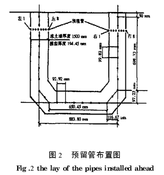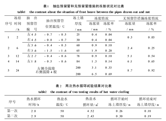 2.3 预留管拔除法模拟试验2.3.1 试验原理 随着冻土墙的形成和发展,逐步抽出预留管,其形成的空间将吸收冻土变形,以减少冻土向上的冻胀量,减低冻胀力。预留管布置如图2。2.3.2抽出预留管和无预留管措施的冻胀情况对比见表1