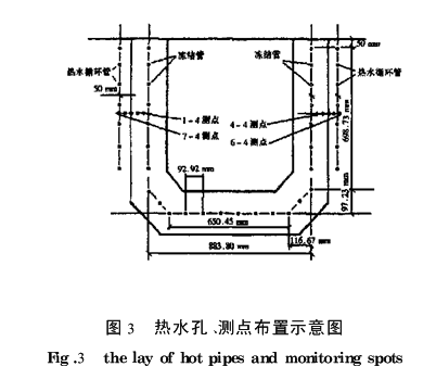 2.3.3 试验结果分析 (1)在冻结时间和冻土墙厚度基本相同的情况下,采取了抽出预留管的措施能有效减少冻胀量和冻胀率。 (2)当模型冻土厚度约200mm时(即原型冻土厚度为1.5m),左侧全拔除预留管的冻胀量和右侧部分拔除预留管的冻胀量较未采取措施的冻胀量分别减少了64.4%和25.3%。2.4 热盐水循环法模拟试验2.4.1试验原理 土的人工冻结是不稳定温度场,具有不稳定边界性质。用热盐水循环吸收冷量达到限制冻土边界,不使冻土过量扩展,保护周围的建筑物。热水管的布置见图3。