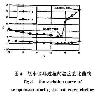 2.4.2 试验结果分析 (1)在循环时间(2.8h左右)相同,热盐水温度(50℃左右)相同的情况下,增加盐水流量(大于0.828m3/h)对抑制冻胀无影响(见表2) (2)从热水循环过程中温度场的变化曲线(图4)可以看出,当热水循环开始,离热水循环管1cm的6-4测点升温很快,而距离热水循环管11cm的4-4测点温度仅略有升高。可见,使用热水循环能够有效的控制冻土的边界,同时也不会使冻土墙内部的温度升高,保证了冻土墙的强度。