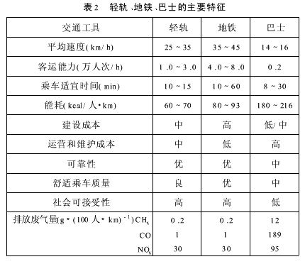 4.2轻轨与地铁、巴士的技术经济指标对比 轻轨、地铁和巴士作为三种主要的运输方式,在公共运输领域中发挥着重要的作用。轨道交通是一种大容量、中长运距的城市客运交通骨干系统,巴士是可提供“门到门”服务的城市客运的主体。表2是这三种运输方式的主要特征。
