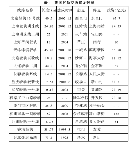 通过表2可看出轻轨有以下的优点:1)投资少,见效快(相对于地铁);2)乘客上下速度快(通常8s~20s),车辆周转快,客流疏散快;3)安全、舒适,受天气影响小,可在坡度大、弯道小的线路上正常行驶;4)运营成本少,票价低,能够吸引乘客;5)作为绿色交通,污染小,符合可持续发展。4.3 我国轻轨的应用前景展望 我国大连、长春等城市有有轨电车线,可供改造规划,别的城市可以考虑利用既有铁路枢纽的线路或改造城市的废弃铁路。充分利用现有的资源,结合城市自身的特点,多方筹措资金,加强体制管理,轻轨可应用于我国大多数的大中城市中,在城市交通中发挥骨干的作用。5 结束语 文章主要介绍了轻轨技术在欧洲、美洲、澳洲及亚洲的发展概况及我国的建设现状。研究、分析了轻轨在我国的建设条件,总结、概括了轻轨的优点,在此基础上提出发展轻轨公共运输系统是我国可持续发展前提下解决城市交通堵塞、保护城市环境、提高公众服务质量的有效措施之一,在我国大中城市中有广泛的应用前景。