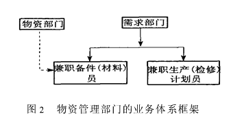 1.2业务体系 物资管理部门的另一个重要职能就是按照预算和计划,及时为需求部门提供相应的物资保障。这需要物资部门和需求部门的通力合作,加强业务联系,各需求部门应设立专(兼)职物资管理人员共同开展工作。 目前,公司的组织构架中,各需求部门未设备件(材料)员岗位,其需求计划缺少扎口管理的保障;同时备件(材料)的计划又应来自于生产(检修)计划,而岗位设置中又没有生产(检修)计划的定编,这同样也会造成源计划的混乱。因此,从业务组织体系上要作进一步完善,各需求部门应设立兼职生产(检修)计划员以及兼职备件(材料)员,其行政管理隶属本部门,业务管理上要和物资管理部门建立专项联系,以便于物资专业上的有序管理。物资管理部门的业务体系框架应如图2所示。