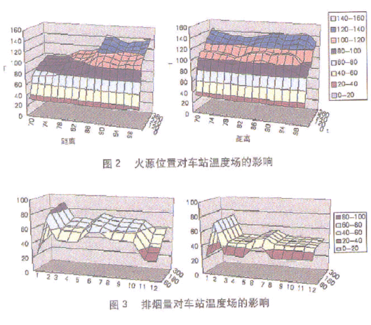 图1为CFD模拟的输出结果,它进行的是三维计算,不但可以得到计算区域内任意时间的任意一点的各个参数值,而且可以处理成图1所示的结果,从中可以清晰地看到整个断面的温度分布情况。 利用CFD通过有效空间范围的三维几何模型的建立、数据化网格的划分、差分格式的确定以及边界条件的设置,可以对地下空间的相关环境因素和参数进行模拟计算。总体而言,CFD通常包含如下几个主要环节:建立数学物理模型,数值算法求解,结果可视化。经过对结果的比较、分析,可以总结归纳出影响地下空间环境控制的各种因素,从而可以有针对性地采取相应的解决措施和办法,以便对地下空间环境进行有效的控制。它能够解决SES软件解决不了的一些问题。例如,我们利用CFD通过对地铁车站火灾工况进行模拟计算,根据得出的计算数据和直观形象化的结果(图2、3)可以分析出火灾强度、火源位置、燃烧时间、烟气流动、排烟形式及排烟量等对地下车站内部空间环境的影响,由此可以制定有效的防排烟措施和人员疏散方案,保证火灾情况下地铁车站内的乘客及工作人员的安全撤离,同时为消防人员创造扑灭火灾的条件。类似这些直观形象化结果的比较和分析都是SES软件目前所不能做到的。SES软件虽然对地铁的地下车站、区间隧道以及铁路、公路隧道具有较强的适用性,而CFD则可以适用于包括地铁在内的所有地下空间,具有更广泛的应用范围和领域。