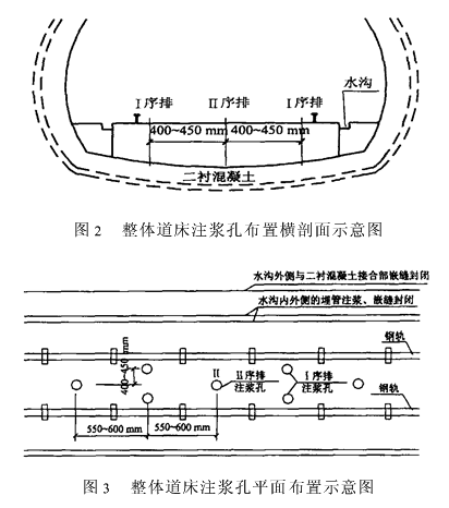 1)沿水沟与整体道床接合部位钻孔,孔径φ10mm,孔深150mm,孔距350~400mm。 2)沿水沟与隧道壁和水沟与整体道床接合部位开槽,槽宽及槽深各为20~30mm。 3)清孔、清槽,无水部位采用水泥-EAA环氧胶泥对孔、槽进行封闭;有水部位采用早强水泥封闭,要求压贴紧密。 4)用环氧材料注浆时如发现压力未达到要求,应先用水泥浆充填注浆,注浆压力为0.3MPa;达到压力后再改用环氧材料注浆,压力为0.5MPa。3.3 整体道床的加固 此项是本次施工的重点,其加固方法为: 1)在两钢轨间的道床上共布注浆孔3排(排距400~450mm),分Ⅰ、Ⅱ顺序先后注浆,孔径φ32~36mm,孔距550~600mm,孔深在二衬混凝土内达200~250mm,不能钻穿防水层,要求清渣清孔,采用早强水泥封孔埋管。如图2、图3所示。