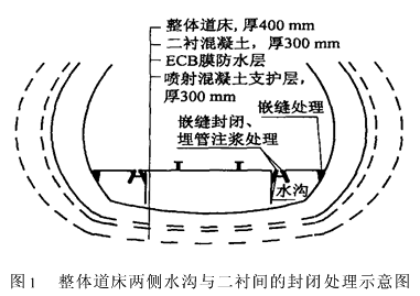 3整治的施工方案 先进行水沟封闭处理,再进行整体道床的注浆加固。3.1破损水沟的修复 1)对破损部位进行清凿,根据缺陷状态布孔注浆,孔距300~350mm,孔径8~10mm。缺陷部位如渗水的水流较大,应采用速凝水泥封堵,然后进行混凝土修复。 2)采用水泥-EAA环氧材料进行复合注浆。 3)施灌压力应根据充填的密度确定,原则上控制在0.5MPa左右,并要求重复注浆。 4)破损水沟的修复要注意保持水沟底面的纵坡,以确保排水畅通。3.2未破损水沟的处理 对未破损水沟的缝隙也进行嵌缝封闭和埋管注浆处理,如图1所示。