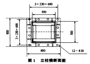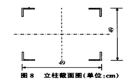 由:y′max=(pal2/24EI)(3-4a2)=0.82, 考虑横担动载系数为1.1,则ymax=y′max×1.1=0.9。 结论:ymax<l/750=0.91。3.3.3 强度校核 由:σ=M/Wx=pa/Wx=(14165×230)/5180=629kg/cm2。 结论:σ<[σ]=2194。3.4立柱设计 立柱截面见图8。