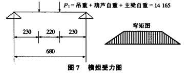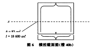 3.2.2 刚度校核 由:y′max=pl/48EI=0.65。 考虑主梁动载系数为1.1,则ymax=y′max×1.1=0.72。 结论:ymax<l/750=1.27。3.2.3强度校核 由:σ=M/Wx=(pl/4)/Wx=(12000×950/4)/3493=816kg/cm2。 结论:σ<[σ]=2194。3.3 横担设计3.3.1 横担截面(以下由横担最大受力点分析见图6)