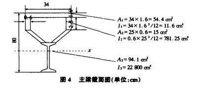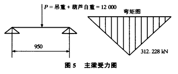 3.1.2 强度条件:容许强度见BJ17 88钢结构设计规范σ≤[σ]=215N/mm2=2194kg/cm2。3.2 主梁设计3.2.1 主梁截面(见图4) 由:yx=∑yiAi/∑Ai=(y1×A1+2y2×A2+y3×A3)/(A1+2A2+A3) =(79.2×54.4+2×65.9×15+20×94.1)/(54.4+2×15+94.1)=45.756cm。 得:y1=79.2-45.756=33.444cm, y2=65.9-45.756=20.144cm, y3=20-45.756=-25.756cm。 由:∑I=∑Ii+∑yi2Ai。 得:∑I=I1+2I2+I3+y12×54.4+2y22×15+y32×94.1=159817cm4。 由:Wx=I/ymax。 得:Wx=159817/45.756=3493。 主梁受力图(以下由主梁最大受力点分析见图5)