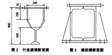 立柱使用材料说明:柱杆采用L80×80×8×9800,横杆采用L80×80×8×480,每500为一组,上下法兰采用16板,护座、肋筋采用10钢板,材质均为Q235。 技术要求:柱杆与横杆间满焊,焊缝高10mm,柱杆与上下法兰间满焊,焊缝高10mm。2.2 行走梁的设计(见图2)