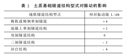 (1)在一定运行速度范围内,地铁隧道振动振级随列车运行速度的增加而增加,大体上速度每增大1倍,振动振级增加约6dB; (2)轮轨表面不规则,将使振级增加5~10dB,车轮不圆整将使振级增加10~22dB; (3)国外有关不同隧道结构修正值的研究结论见表2。在相同地质条件下,当隧道材料相同时,结构厚度增大1倍,墙壁振动可降低5~18dB,而混凝土单洞隧道振动低于铸铁或铸钢单洞隧道壁振动;三洞隧道结构振动低于双洞隧道结构振动,站台结构振动最低。3地铁振动的传播 地铁振动产生的是纵波、横波、表面波合成的复杂波动现象,其传播形态也较为复杂。根据已有的研究成果,近场的振动波型主要以弯曲波形式传播,远场主要以表面波形式传播。振动的传播途径是从轨道传到轨道扣件和道床,再传递到隧道和岩土,从而引发附近地面建筑物的振动。在振动的传播特性上,主要有以下结论[2,4,6,7]: (1)地铁列车运行时,在振动振源的频率分布上,以人体反应比较敏感的低频为主,其中50~60Hz的振动强度较大; (2)振动传播过程中,振动随着距轨道水平距离的增加而衰减。高频分量随距离衰减较快,低频部分衰减较慢;水平向振动比铅垂向振动衰减得快。因此,对地面及建筑物的影响主要是铅垂方向振动; (3)振动的频谱随距离而改变,地铁振动最大值对应的频率在10~30Hz范围内; (4)地铁列车对临近建筑物的振动影响范围不超过100m,此范围外的建筑物振动可忽略不计。具体影响范围会因隧道结构和地质条件不同而不同; (5)影响振动传播的主要因素有列车运行速度、隧道埋深、地质条件等。地铁运行速度越高,建筑物的振动响应越大;隧道埋深越大,影响范围越小;地质条件不同,对振动能量的耗散大小不同; (6)列车振动引起的沿线地面建筑物的振动,在建筑物方面,其振级的大小与建筑物的结构形式、基础类型以及与地铁线的距离有密切关系。4地铁振动控制措施 地铁运行产生的振动问题可以在地铁工程最初的规划、设计和施工阶段通过一些措施得到一定程度的控制。4.1规划阶段的控制措施 在最初的规划阶段,文献[5]认为,要把线路选择和城市规划结合起来考虑。 (1)线路走向尽量与城市快速路、主干道或次干道重合。 (2)合理控制地铁线路两侧拟建建筑物的建设距离。 (3)在轨道交通规划布局中,应充分利用振动波的天然屏障,如河流、高大建筑物等,来阻隔振动的影响。4.2设计施工阶段的控制措施 在设计施工阶段,采取合理的隔振、减振措施,能有效减少地铁振动带来的问题。隔振是用一些弹性元件或其他措施隔断部分振波的传播;减振是在产生振源的设备或部件上加装阻尼结构或阻尼元件,或者增加设备或元件本身的阻尼来达到减振的目的。根据地铁振动的产生、传播和相关因素的分析,可以从振源减振控制、振动传播途径控制、受保护建筑物控制三方面来考虑地铁振动的控制。4.2.1振源减振控制 从振动源头减小振动是最直接的控制方法,根据地铁振动产生的机理和影响因素的分析,可以采取以下具体措施[3~6,9]。 (1)车辆轻型化。 (2)车轮平滑化。通过采用弹性车轮、阻尼车轮和车轮踏面打磨等车轮平滑措施,可有效降低车辆振动强度。 (3)采用重型钢轨和无缝线路。 (4)采用盘式制动。 (5)采用直线电机。直线电机具有造价低、振动小、噪声低、能耗低、污染小、安全性能好等诸多优点,是21世纪城市轨道交通发展的方向。 (6)适当控制地铁列车运行速度。 (7)采用适当的弹性扣件或轨道减振器。目前国内地铁通常采用的扣件型式主要有DTI型~DTⅦ型、WJ2型和单趾弹簧扣件等,这些扣件主要用于一般减振要求的路段,大部分扣件可降低振动2~9dB;在减振要求较高的地段常采用轨道减振器。目前,轨道减振器常用的有科龙蛋减振器、改进型科龙蛋减振器、轨枕靴等新型减振器。其中,轨枕靴减振效果最优,可达19dB;其次为改进型科龙蛋,减振7~8dB;科龙蛋减振值为3~5dB。 (8)选择合理的轨道结构类型,降低振源的激振强度。目前,除传统的有碴轨道结构以外,还有浮置板轨道结构和弹性短轨枕轨道结构(LVT,即索尼威尔低振动轨道)这两种减振型轨道结构。根据德国实测资料,浮置板式轨道结构减振效果可高达30dB,其缺点是造价较高。香港的西部铁路在不同路段分别采用了浮置板轨道结构和弹性短轨枕轨道结构,取得了很好的减振效果,使香港西铁成为世界最安静的轨道交通线路之一。国内的广州地铁1号线、2号线也都合理采用了这两种轨道结构,达到了预期的效果。但是,这两种轨道结构的造价相对较高。4.2.2振动传播途径控制 通过对振动传播途径及其影响因素的分析,采取一些隔振或其他措施,可使得振动的影响降低[2,3,6,8,10]。 (1)在钢轨与轨枕之间加隔振材料。主要有橡胶隔振垫板和浮置板隔振系统。橡胶隔振垫构造简单,施工方便,不足之处是隔振效果较小,比一般道床结构可增加传递损失4dB左右;浮置板隔振系统是一种质量—弹簧隔振系统,既可用于有道碴轨道,也可用于无碴轨道,减振效果最好,缺点是造价较高。 (2)增加隧道埋深,增加隧道壁厚,根据实际情况选取合适的隧道结构。隧道埋深越大,振动影响越小,隧道厚度对隧道振动有十分明显的影响,材料相同,隧道厚度加大一倍,隧道壁振动降低5~8dB,隧道结构对振动的影响前面已有论述,不再重复。 (3)对于有碴轨道,增加道碴厚度,在道碴床和隧道之间