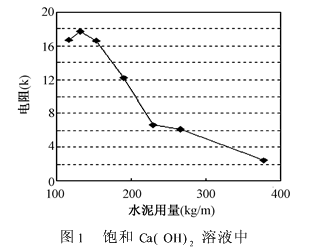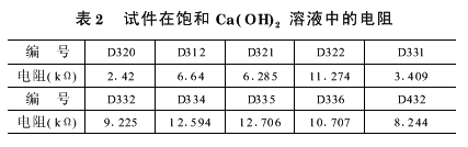 混凝土试件尺寸(cm)为10×10×10,成型时在向上一面的中心位置垂直插入直径8mm、长8cm的钢筋。钢筋的两端都埋入试件内,在钢筋的一端焊有绝缘铜线,绝缘铜线露在试件外的长度约为25cm。试件养护28天后在上下面和三个侧面涂环氧树脂封闭,保留一个侧面不涂。2.2混凝土试件在Ca(OH)2饱和溶液中的模拟试验 实验时,模拟地铁现场的工况,将混凝土试件和电极板放入盛有液体的容器内,试件的开放面与电极板平行,距离1cm。试验时接直流电,钢筋接正极,电极板接负极,测量直流条件下短时间内的电流电压关系。研究结果表明,混凝土在液体介质中的导电符合欧姆定律,其电阻与长期通电试验的结果相符,见表2。