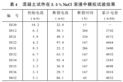 由计算结果并经试验验证,推算出合理的矿渣微粉、粉煤灰的掺加量,可使高性能混凝土抗地铁杂散电流腐蚀能力,比同量级的水胶比基准混凝土提高6~8倍。2.3混凝土试件在海水环境中的模拟试验 为检测钢筋混凝土在海水环境下抗地铁杂散电流腐蚀性能,进行了在3.5%NaCl溶液中的模拟试验,结果见表4。