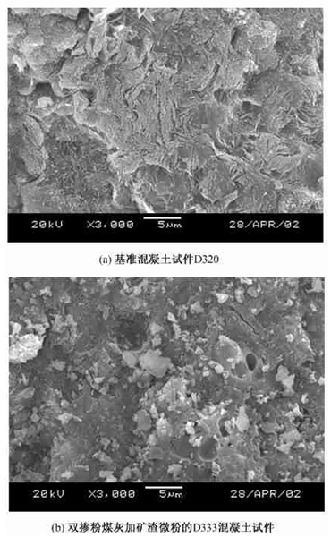 从试验结果可见,混凝土试件在3.5%NaCl溶液中电流变动大,腐蚀快,中断早。在有电压时,中性溶液中的氯离子,不仅仅是电荷载体,更重要的是与混凝土的组分和钢筋、焊接点发生化学反应,改变导电条件,同时很快地腐蚀混凝土、钢筋、焊接点。因此,氯盐溶液极大地增强杂散电流对地铁建筑结构的腐蚀,极具破坏性,必须坚决避免。2.4微观机理分析 双掺粉煤灰加矿渣微粉对钢筋混凝土抗地铁杂散电流腐蚀的改善机理,主要是提高了混凝土的密实性,图2为D320和D333混凝土试件养护180d时的显微电镜照片。由表1可知,其中,D320为基准混凝土试件;D333为双掺粉煤灰加矿渣微粉的混凝土试件。