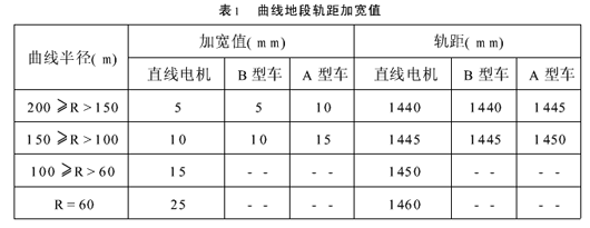 时 超高公式H=11.8V2/R 缓和曲线长度公式l=0.007VH≥20m3.4超高计算 超高公式H=11.8V2/R 不同曲线半径、不同速度的超高计算结果汇总略。3.5竖曲线最小半径和设置竖曲线两相邻坡度差计算 由于直线电机系统对车辆电机与感应板产的间隙有严格要求,而间隙误差来自轨道、线路等各个方面,这样留给线路的误差约为1mm。计算结果为:当相邻坡度差△i≥1.6时应设竖曲线,而竖曲线最小半径为R≥3125m,考虑各种因素取△i≥2‰时需设置竖曲线,竖曲线最小半径为R≥3000m。(感应板长度分5m、2.5m、1.25m三种)4按日本公式进行计算 车辆参数: 最小平面曲线半径:正线为100m,辅助线为50m; 车辆长度:A车约15800mm,B车约15600mm; 车体宽度:车体外部最大宽度=2490mm,在站台高度处外部最大宽度为2490mm; 列车结构速度:80km/h,列车最大运行速度70km/h; 起动平均加速度(0~35km/h)≥0.9m/s2; 转向架轴距:1900mm,车辆定距:10500mm,自导向转向架; 车轮直径:660mm(新轮)。4.1缓和曲线长度计算 公式Ⅰ:l1=400H H-超高 公式Ⅱ:l2=5.25HV H-超高(m) V-速度(km/h) 计算按最大超高120mm,最大欠超高60mm进行。从计算结果可知,相同曲线半径和超高公式Ⅰ、公式Ⅱ的计算结果是不相同的,取值按相同曲线半径、相同超高下按两个公式计算的大值取,结果汇总略。4.2轨距加宽 公式:S=1805/R-6 R-曲线半径(m) 表1结果表明当R≤200m时需进行轨距加宽。列下表并与地铁规范中的A型车和B型车进行对比:
