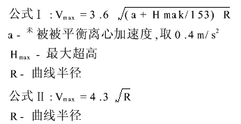 除了Hmax=120mm外,还对Hmax=130mm和Hmax=140mm计算结果进行了比较,结果显示,最大超高由120mm提高到130mm和由130mm提高到140mm,同一半径下的速度只增加3km/h左右。同一曲线半径,公式Ⅱ的计算结果比公式Ⅰ的大3~9km/h。取值原则按计算最大速度预留适当的安全富裕量。(2)根据未被平衡的离心加速度计算公式