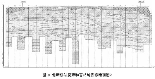 图2 盾构试验段线路平面图3、试验段工程地质及水文地质条件(1)工程地质条件 试验段范围内的地层从上到下依次为 ●人工填土层(Qml),其中包括: 杂填土①-1:主要成份为碎石、炉灰、房碴土等,稍湿,局部呈饱和状态,松散~稍密,一般厚度为1~1.5m,局部最厚处为2.7m。 粘质粉土素填土①层:稍湿~饱和,可塑~硬塑。一般厚度为1.0m,局部最厚处为2.2m。 以上两层的总厚度为2.0m左右,局部最厚处3.0m。 ●第四纪全新世冲洪积地层(Q4al+pl),其中包括: 粘质粉土砂质粉土②层:稍湿~饱和,可塑~硬塑。该层在不同地段分别夹有粉质粘土②-1层、重粉质粘土②-2层。局部夹粉细砂透镜体②-3层。该层总体厚度在雍和宫附近较薄,最薄处为4.0m,一般厚度为5.0~7.0m。粉细砂③层:湿~饱和,密实,局部夹砂质粉土薄层,下部为中粗砂③-1层、砾砂③-2层或粉质粘土粘质粉土③-3层。该层的总体厚度为3.0~7.5m。 ●第四纪晚更新世冲洪积地层(Q3al+pl),其中包括: 圆砾④层:饱和,密实。砾石为亚圆形,未风化~微风化。一般粒径为5~20mm,最大粒径为150mm,中粗砂填充,局部成为中粗砂④-2层透镜体。该层中部或底部颗粒较粗成为卵石④-3层,其一般粒径为20~80mm,最大粒径可达210mm,中粗砂填充。至雍和宫附近,圆砾、卵石层逐渐尖灭,出现粘质粉土④-1层,厚度为3.0m左右。第④层的总体厚度为6.0m左右,最薄处3.0m,最厚处8.3m。粘质粉土砂质粉土⑤层:饱和,硬塑,局部夹细砂透镜体。本层夹粉质粘土重粉质粘土⑤-1层。本层厚度为2.0~5.0m,最薄处仅1.5m。 中粗砂⑥层:饱和,密实,含少量砾石,夹粉细砂⑥-1层和粉质粘土重粉质粘土⑥-2层。本层厚度为0.7~7.8m,局部缺失。 卵石⑦层:饱和,密实。卵石为亚圆形,未风化,一般粒径为20~80mm,最大粒径为200mm,中粗砂或粘性土充填。局部地区颗粒较细渐变为圆砾或砾砂⑦-1层。本层的一般厚度为2.0~5.0m。粉质粘土粘质粉土⑧层:饱和,硬塑~坚硬,夹重粉质粘土⑧-1层和粉细砂⑧-2层。本层厚度为2.0~8.0m。 卵石⑨层:饱和,密实。卵石为亚圆形,未风化~微风化,表面可见溶蚀孔洞。一般粒径为20~60mm,最大粒径为180mm。中粗砂或粘性土充填。夹中粗砂⑨-1层。本层厚度大于7.0m。