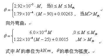 试验基本结论: 通过试验发现,在一定的轴力作用下,管片的张开角度与弯矩基本呈直线变化。但当弯矩超过某一特定值时,其线性关系的斜率增大。该特定值已经大大超过管片的实际限值。 由于管片螺栓布置对截面的不对称,内刚度(向内弯曲刚度)一般相当于外刚度(向外弯曲刚度)值的两倍。 在试验段隧道轴力作用下的转角基本上可以用下述公式描述(不同轴力条件下也同样可以有类似公式描述):
