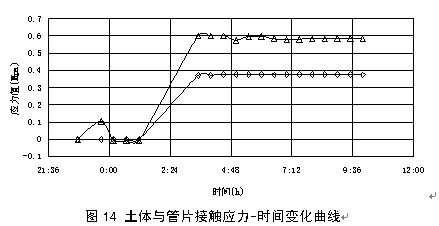 经过现场测试发现,无论管片与地层的接触应力还是钢筋应力均呈现与前述螺栓轴力基本相似的变化状态和规律。 接触应力发展规律(见图14):