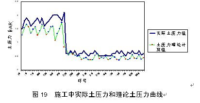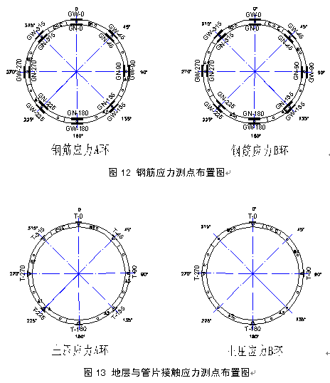 由上述公式可以推导出地铁五号线盾构试验段管片的向内和向外弯曲的接头刚度为: Kθ内=34000KN-M/rad Kθ外=17000KN-M/rad 考虑到北京地区地层具有一定的自稳能力,在设计计算时,可对实验数据作一定折减后采用,建议取值为: Kθ内=30000KN-M/rad Kθ外=15000KN-M/rad 通过现场测试和接头刚度试验,基本摸清了盾构管片接头在施工过程中和隧道形成后的受力规律,并提供了北京地层条件下类似工程的管片接头刚度参考值。2、盾构隧道与地层的相互作用规律研究 为研究盾构隧道施工过程中地层荷载作用的变化规律以及荷载分布规律,我们进行了现场测试、室内模型试验和理论分析等方面的研究。(1) 现场测试研究 在现场进行了大量的结构内力、隧道与地层的接触应力和变形测试,测试断面测点的分布见图12、图13所示。
