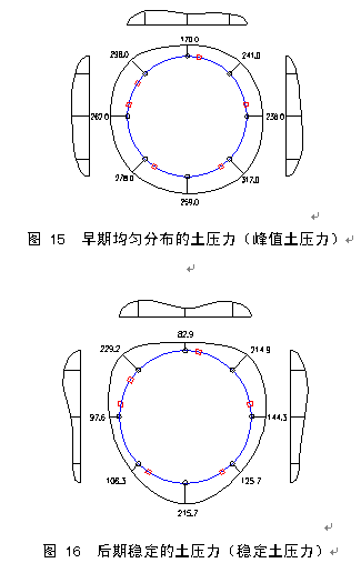 ●初始阶段 当管片拼装完成,仍停留在盾尾内部时,由于尚未受到周围的荷载作用,因此接触应力较小。 ●推进阶段 管片逐步推出盾尾并同步注浆后,接触应力呈线性逐渐增加。主要原因是管片推出后,由于注浆浆液压力形成了对管片的作用。此过程一般持续1~2小时。 ●稳定阶段 在管片推出盾尾,同步注浆完成后,其接触应力能够维持在一定数值范围内,直到注浆浆液凝固。 ●后期发展 接触应力在盾构刚刚推出盾尾时,在隧道周边的分布是比较均匀的,反映出半流体作用的特征(见图15)。但当浆液凝固后,周边的接触应力发展则呈现出不平衡的状态,上大下小(见图16)。