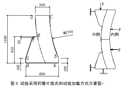 ●初始阶段对螺栓首先进行标定,然后插入到螺栓孔中,在螺栓上紧以前,其应力维持在较低的水平。螺栓拧紧分两次实现,第一次先进行预紧,施加总紧固力的20%~30%,第二次紧固到位,从图上可以明显看出其过程,拧紧螺栓后,当管片尚位于盾尾内部时,螺栓应力一直维持在紧固应力的水平。 ●推进阶段随着盾构机的推进,盾构管片被推出盾尾,在此过程中,螺栓的应力均匀下降,其下降幅度很大,有些部位甚至螺栓应力接近0,这一过程显示出螺栓的暂时“失效”现象。初步分析其主要原因是:随着盾构管片推出盾尾,具有一定压力的同步注浆浆液逐步充满管片隧道周围,产生轴向的压力,使个管片之间的橡胶止水带被进一步挤密,导致螺栓松弛。 ●应力维持阶段盾构推出盾尾,螺栓应力松驰后,在一定时间范围内,螺栓继续维持低应力水平,量值增加不大。一般情况下这一阶段可持续8~10个小时左右,与浆液的凝固时间基本一致。初步分析其主要原因是:盾尾注浆浆液凝固并达到强度以前,对盾构隧道的作用仍基本为轴向力,与上一阶段相似。 ●应力上升阶段应力维持阶段后,随时间的推移,螺栓的应力呈线性上升,直到维持与初期紧固应力相当的水平。应力上升阶段的时间一般持续30天左右。 初步分析其主要原因是:随着注浆浆液硬化,管片与地层间形成了硬性接触,地层的变形直接作用在管片上,又由于各方向地层荷载的不同,破坏了原来一直保持的周边均匀作用,使管片接头发生转角,螺栓受拉。这种地层变形达到一定的程度后,地层与隧道间又形成了一个相对平衡的受力体,并维持稳定。根据以上各阶段的情况,可以初步归纳以下几个结论: a.在盾尾拼装阶段,螺栓的主要作用是将预制管片连接起来,确保推出盾尾前隧道环的稳定,并保持盾构隧道的形状; b.盾尾注浆浆液的凝固时间决定了盾构隧道与地层作用(直接作用)的早晚,地铁五号线盾构试验段隧道的这一时间为8~10小时,在有条件的情况下,应尽量缩短浆液的凝固时间; c.由于北京地层具备比较好的自稳能力,对圆形盾构隧道而言,隧道与地层相互作用达到稳定的时间比较长,约为30天; d.隧道与地层的受力平衡作用要靠隧道的变形来形成,一般情况下螺栓应力上升阶段的时间比较长,建议施工期间在管片推出盾尾后2天左右对螺栓进行二次紧固,这样可以相对提早使隧道与地层间形成受力平衡关系; e.地铁五号线盾构试验段螺栓的初始紧固应力为50~100 N/mm2左右。(2)管片接头刚度试验研究 根据对不同接头刚度的管片环的力学分析,接头刚度大小对管片的受力有较大影响,而管片接头刚度由于接触面受力和变形的复杂性,仅靠理论分析无法准确给出。因此我们开展了管片接头刚度室内试验研究,采用原型管片进行测试。 试验主要想达到以下几个目的: a.研究管片环向接头弯曲变形特性; b.研究管片环向接头的刚度; c.研究弯曲过程中接头联接螺栓的受力和变形规律; d.研究弯曲过程中接头附近的钢筋与混凝土的变形和破坏规律。试验采用的管片型式与加载方式见图8。