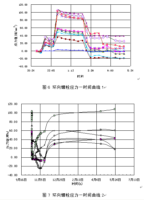 试验段只进行了环向螺栓应力测试,螺栓应力随时间变化规律见图6、图7所示,其应力变化过程主要有初始阶段、推进阶段、应力维持阶段和应力上升阶段等。