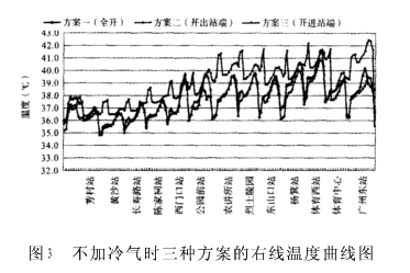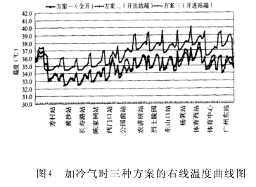 2.1正常运行方案 方案一:开启车站两端活塞风道和两条隧道的迂回风道的风阀,即左右线在车站两个端头连通且与活塞风道连通。 方案二:开启车站两端活塞风道和迂回风道出站端风阀,即活塞风道设于车站的出站端。 方案三:开启车站两端活塞风道和迂回风道进站端风阀,即活塞风道设于车站的进站端。 每种方案又分加冷气与不加冷气两种情况,进行模拟计算,并分析比选。2.1.1不加冷气的正常运行方案 以上三个方案均不需要改变原设计活塞风道、风机、风阀的设置,只需改变正常运行的运行模式。根据前面三个方案,建立了隧道通风模拟计算模型,用SES(SubwayEnvironmentalSimulationComputerProgram,美国交通部组织编写,目前最新版本为SES-V4.1)进行模拟计算,模拟计算结果见图3所示。