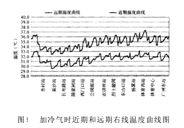 从图4中可以看出隧道温度已有较大改善,但方案三仍然偏高,方案一、二的隧道温度基本控制在37℃以下,且方案二略优,故设计推荐采用方案二,即活塞风道只与车站隧道的出站端相连通。 如果按方案二运行,仍有部分区间隧道及车站温度超过原设计标准35℃,其环境条件不满足现有列车寿命内的运行条件,所以对近期的情况也进行了模拟计算,根据原设计,列车近期(15年后)高峰小时行车对数为20对,即发车间隔为180秒进行模拟计算,计算结果见图5。从图中可以看出区间隧道及车站隧道内的温度均低于35℃。因此近期内采用方案二对列车运行环境无影响。由于列车空调的使用年限约为15年,使用15年后基本上需要更换,推荐在15年后的列车空调改造及采购新列车时,列车空调按37℃的运行环境改造及设计,以满足远期的运营要求。