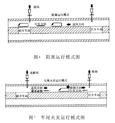 2.2事故运行方案 由于原隧道通风系统阻塞运行时,虽然初始温度较原设计有约2℃的提高,但改善了原设计隧道风机运行时的通风效果,从总体来说原设计基本应能满足阻塞运行的要求。当发生区间阻塞情况时,可开启阻塞区间后方车站同一条隧道两端的两台隧道风机送风,前方车站一台隧道风机排风,并相应打开前方车站的车站轨道排风系统。通风方向与行车方向一致,同时屏蔽门应保持关闭状态,以保证区间的气流组织,如图6所示。并且在设置有射流风机或推力风机的特殊区段,还可运行相关辅助设备强制组织气流方向,保证区间隧道的平均温度及风速满足相关标准。 当发生火灾情况时,排烟组织需根据列车的具体着火部位选定执行模式。一般而言,当列车车头着火时,采用与行车方向一致的方向组织排烟;当列车车尾着火时,采用与行车方向相反的方向组织排烟;当列车中部着火时,则根据列车与两边中间联络通道的距离确定送风方向;当火灾位置不清楚时,按与行车一致的方向送风。排烟模式运行时,需通过区间两端车站的隧道通风设备的组合运行,保证火灾隧道的断面风速≥2m/s,有效控制烟气的流向,防止烟气蔓延。2.3方案实施 推荐方案采用每个车站两端的活塞风井与出站端隧道连通,原车站隧道的轨顶和站台下回风系统改造成为排风系统,由车站通风空调系统按各车站的改造工艺完成,因此只需调整原有系统的运行模式而不增加任何设备,即只需改造BAS系统软件即可。3广州地铁一号线加装屏蔽门经济性比较 车站加装屏蔽门后,将车站与隧道隔成两个空间,极大地减少了车站冷量泄漏,从而大幅度地减少了车站的冷负荷,按远期运行条件计算,各车站公共区的冷负荷比原系统有较大减少,包括计入送入隧道的冷量后,平均到每台组合式空调器的冷负荷基本上比每个车站原有一台组合式空调器冷量略有减少,总的送风也略有减少。以目前正在改造的黄沙站为例,改造前和改造后的空调设备和运行费用比较如表1所示。