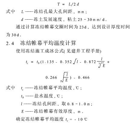 工程地质条件:联络通道位置地面标高为+2.2m左右,隧道上覆土层厚14.6m。联络通道施工范围内土层主要为第四系全新统中组相层粉土、淤泥质粉质粘土和第四系上更新统三组相层粉质粘土,其土层土质松软、结构松散、孔隙比大、含水丰富、承载力低、容易压缩和在动力作用下易流变,开挖后天然土体本身难以自稳。因此,在该地层内开挖构筑联络通道前,冻结帷幕的质量尤为重要。2 冻结帷幕方案设计2.1 冻结帷幕方案设计 冻结帷幕方案设计的基本原则是:①冻结帷幕方案设计必须满足联络通道施工的安全和质量要求,即保证冻土帷幕有足够的强度,冻结帷幕水平孔(斜孔)布设合理,满足施工及规范要求,在设计中应重点考虑联络通道顶部薄弱部位。②冻结帷幕水平孔(斜孔)冻结方案应结合现场实际情况,便于隧道开挖和支护,施工安全、可靠,施工费用低,施工工期短。③设计应考虑对冻胀、融沉的防范措施。2.2 冻结帷幕厚度设计 根据在部分地铁工程联络通道冻结施工经验计算式:t=Aln(r/E)式中 r———计算点到冻结管距离,m; E———冻结帷幕外侧厚度,m; A———经验参数,取A=19 69; T———计算点冻结帷幕温度,℃。冻结帷幕内侧厚度E′=1 .4E,冻结帷幕平均厚度1. 4m。 由于联络通道结构复杂,土层条件差,考虑到工程的安全及质量等,对冻土帷幕采用有限元分析软件ANSYS进行了应力场分布和位移场分布情况的三维有限元数值分析,并根据计算结果进行了强度验算,确定设计冻土帷幕厚度为:嗽叭口1.6m,联络通道1.4m,集水井1. 2m。2.3冻结帷幕交圈计算 冻结前,同一深度的地层具有相同的原始温度,冻结开始后,通过冻结管把冷量传给地层,在冻结管周围产生降温区,形成以冻结管为中心的冻结圆柱,并逐渐到相邻的冻结圆柱连接形成封闭的冻结圆筒,形成冷冻结层,即为冻结帷幕交圈。 冻结帷幕交圈时间主要与冻结孔间距、盐水温度、土层性质、冻结管直径、地层原始温度、以及冻结器环形空间内盐水运动状态等因素有关。冻结帷幕交圈时间计算公式为:
