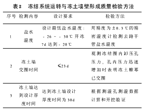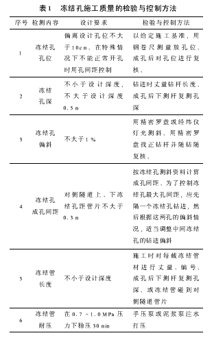 由于该联络通道位于闹市区地下,地面有天津图书大厦、建行大厦等重要建筑设施,且所处地层主要为粉质粘土,含水量高,因此,在地层冻结施工中必须采取切实可靠的技术措施,以确保联络通道施工和地面建、构筑物和交通安全。根据地铁联络通道的施工经验与教训,我们在设计及冻结施工过程中对以下方面进行了分析和控制:3.1冻土帷幕强度问题 冻土帷幕的关键点在其拱部,在联络通道顶部设三排冻结孔,以加大冻土帷幕拱部厚度,并使联络通道顶部的一排冻结孔穿越对面隧道顶部管片,确保冻土帷幕拱部与隧道管片间的有足够大的接触面积;为了确保冻土帷幕强度和稳定性,在具体结构设计时,选择比较安全的平面弹性计算模型,适当加大安全系数,并用三维有限单元计算进行校核,在工艺设计时,取较大的备用系数,即实际加固范围要比结构设计大。3.2冻土帷幕与隧道管片间的密封 根据地铁联络通道和隧道出洞地层冻结施工经验,由于混凝土和钢管片相对于土层要容易散热得多,会严重影响隧道管片附近土层的冻结速度和冻结强度,从而影响冻土帷幕的整体稳定性和封水性。为此,设计及施工过程中,采用在对面隧道管片内侧敷设冷管和保温层等措施,以确保冻土帷幕不存在影响安全的薄弱环节。3.3冻结孔施工安全与孔口密封 用金刚石取芯钻开孔,跟管钻进法下冻结管。冻结孔开孔前,在布孔范围内打若干小口径钻孔,探测地层稳定情况。如发现砂层,先进行水泥-水玻璃双液壁后注浆,以提高孔口附近地层的稳定性,然后再钻进冻结孔。冻结施工结束后,孔口管管口焊上钢板,以免工程结束后钻孔孔口漏水。3.4冻结过程检测与控制 在冻土帷幕内布置测温孔和压力释放与观测孔,以便正确测定冻土帷幕厚度和判断冻土帷幕是否交圈。对侧隧道管片附近土层的冻结情况将成为控制整个冻土帷幕安全的关键,为此,在对侧隧道管片上沿冻土帷幕四周安装测温孔,以全面监测冻土帷幕的形成过程,当泄压孔波动较大,冻结温度停止在某个区域范围内,应加强检测,以确定帷幕是否交圈。冻结孔施工质量的检验与控制方法见表1,冻结系统运转与冻土墙壁形成质量检验方法见表2。