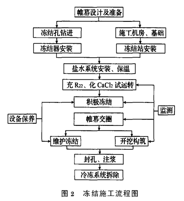 2 .5 冻结孔布置及制冷设计2 .5 .1 冻结孔的布置 根据冻结帷幕设计及联络通道的结构,冻结孔沿通道四周布置,按上仰、近水平、下俯三种角度布置。冻结孔采用上下各三排,左右各一排布置,冻结孔共设77个,开孔间距为0 .5~1 .2m,利用水平孔和部分倾斜孔冻结加固地层,使联络通道及集水井外围土体冻结,形成强度高,封闭性好的冻土帷幕。 在现场实际操作中,可根据钻机情况、管片配筋情况和联络通道拟开管片的实际位置等,对钻孔孔位作少量调整,但最大间距不得大于1 .0m。2 .5 .2 制冷设计2. 5. 2. 1 冻结参数确定 1)设计盐水温度为-28~-30℃。 2)积极冻结时间为30d,维护冻结时间为35d。 3)测温孔和卸压孔分别为8个和4个。 4)冻结管总长度为785m。2 .5 .2. 2 需冷量和冷冻机选取型冻结需冷量:Q=1 2·d·H·K式中 H———冻结总长度,m; d———冻线管直径,m; K———冻结管散热系数,kcal/m2·h。 将上述参数代入公式得Q=65813kcal/h,考虑到其它因素设计工况制冷量为87500kcal/h。3方案设计、施工技术要点分析及措施 冻结帷幕设计及施工过程有方案设计、施工准备、冷冻系统安装等工序组成,见图2。