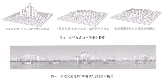 3.2开发空间集中的方式 轨道交通车站地域开发的空间集中方式可以描述为城市空间的竖向积聚。这种积聚除了地面高层建筑的集中外,还有地下空间的集中利用。 高层建筑集中对于保证高强度开发地区的环境具有重要的意义。从局部来看,高层建筑集中能使空地相对集中,便于创造集中的开敞空间;从整体来看,高层建筑集中使车站地区外围空间密度相对降低,从而有利于城市整体空间层次的塑造。轨道交通站点高层集中现象非常显著,特别是在城市的核心圈层通常呈现超高层建筑集中,这是轨道交通为主导的出行方式反映在用地开发上的集约化空间模式。轨道交通出行比例越大,这种空间集中特征就越明显。图3中,高层建筑的集中强度遵循从车站向外围渐降的基础,建筑高度也逐渐向周边降低。从轨道交通走廊整体来看,“珠链式”空间结构得到了形象的演绎(见图4)。