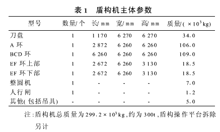 300t盾构机整体吊装技术 广州地铁3号线沥~大区间于2004年进行了盾构机整体吊装转场过站作业。此次吊装,将长8.6m、直径6.3m、重300余t的盾构机主体从约20m深的到达井一次性整体吊出,运至700m外再整体放入18m深的始发井中,前后仅耗时12d。 盾构机主体体积庞大,重心高,前重后轻,三维运动复杂,易发生偏移,盾构机中间较为薄弱,易变形。从距地面20m的井下提升过程要求控制准确,盾构机吊装出井后,装在600t的大型平板车上,穿越地基为淤泥土的临时道路,爬坡经过交通主干道,最后到达700m外的始发井并再次下井。盾构机整体吊装成功比原计划将盾构机分件拆装方式运输大大缩短了工期。1吊装运输设备1.1吊装机具参数 由1台带有微处理器的主控柜控制的4台LSD200B 300 200t液压提升装置,单台提升装置的额定起重量为2000kN。配专用工具及4×16根25m长Φ15.5mm钢索。LSD液压提升系统由预应力锚固千斤顶发展而来,该系统采用钢绞线承重,提升千斤顶集群、计算机控制、液压同步整体提升原理,集机械、电控、液压、计算机程控等多学科技术于一体,结合现代施工工艺,实现了超大、超重、超高构件的大跨度、高空整体提升与平移。 系统主要性能:①可实现平稳提升与下放;②单台提升千斤顶提升力可为1000、2000kN,行程为300mm;③提升速度可根据工程的需要进行无级调节,最高可达20m /h;④在提升过程中,能控制提升构件的运动姿态、应力分布以及各提升吊点的同步性,提升同步精度误差不超过±10mm。 吊装架水平移动依靠8台100t小坦克(可认为是提升架支腿下部的滑轮系统)在轨道梁上移动,保证整个提升架吊起盾构后可以平稳平移。 1套专用吊装架,承载能力为4000kN,自重达2800kN,外形尺寸(长×宽×高)为8000mm×14000mm×19055mm。1.2运输机具参数 牵引拖头为1台TR88M8CK D90型NICOLAS拖头,在爬坡段增加1台BENZ拖头在后部顶推。单台拖头的额定拖载能力为6000kN,功率为559kW。1台12×3轴线400t工况液压全挂车,规格为19370mm×5420mm×(1070±210)mm。 液压全挂车轮子轴数可以按照构件大小进行组合以减小轮压,本次共采用12×12=144个轮子,不同轴的轮子由液压系统控制转向,保证了整个挂车的灵活性。2 有关计算(1)盾构机主体有关数据(见表1)