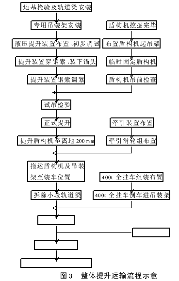 整体提升过程中必须严格控制盾构机和提升架的稳定性。4个液压千斤顶同步差和钢缆绳行程差容易造成盾构机倾斜。在吊装过程中技术人员须严密监测每一个环节,当盾构机吊离地面10cm时,技术人员对盾构机的平衡性及相关部件的安全状况进行彻底检查,保证4个主吊钢缆绳万无一失后才能继续往上吊,盾构机以5m/h的速度向上移动,于8月22日上午吊出地面。吊装设备架本身高16m,重130t,加上盾构机后近430t,水平位移速度控制为5m/h,移位时专人负责控制轨道梁与各支撑间的变化,保证安全。5结语 整体吊装运输共用了12d,期间关键控制时间为提升架的安装拆卸,而提升和下井各用2d,从到达井到始发井700m路程运输只用了lh。吊装完成后经复核盾构机尺寸没有变形,圆满完成了盾构机转场过站任务。相对于盾构机地下过站,因为降低了车站负二层的层高,大大节约了车站维护主体结构、装修和机电安装中不必要的费用;而相对盾构机拆装过站又节约了工序和工期。盾构机整体(转场)过站有相当大的应用前景。参考文献[1] 程晓.盾构施工技术[M].上海:上海科学技术文献出版社,1990.[2] 施仲衡.地下铁道设计与施工[M].西安:陕西科学技术出版社,1997.