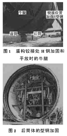 盾构机外径6260mm,盾尾内径6060mm,盾构机身长8170mm(包括刀具为8520mm)。 (2)液压提升机构的负荷率 液压提升机构为200t,4台,各穿16条钢索,实际吊装能力为467 2t,负荷率 1.2×300 467 2×100%=77 1%(1.2为不均匀系数),安全。(3)吊装架强度校核 因吊装架是日本MHILTD为珠海工程2×660MW机组发电机定子吊装而设计,起吊能力为4000kN,故可认为安全。(4)吊装钢丝绳计算 吊装钢丝绳选用6×37+1-Φ65mm(185kg mm2),30m长一对,吊装时采用4点8个头进行挂绳,即将环状绳挂2台液压提升机构,钢丝绳的极限承载力为2900kN。 钢丝绳的安全系数为:0 82×8×2900/ 3000=6.34,安全。(5)移动系统计算 移动总重:140t(吊装架)+300t(盾构机)+80t(吊装附加梁)=520t。 用2台30t液压提升机构进行拖移,小坦克的滚动摩擦系数为0.01,牵引力为52kN,考虑起动系数2.5,牵引力最大为130kN,满足要求。(6)支柱受力计算 支柱受力最大时就是当1个吊装架的支腿走到支柱上方时,此时支柱受力为1818kN,再加80kN轨道梁重,为1898kN。吊装架所有重力分配到4根650mm×400mm×13500mm立柱上,考虑1.2的荷载不均匀系数,每根立柱受力为: F4=1.2×牵引重量=2182.8kN 轨道梁截面尺寸为700mm×1300mm,质量为1400kg。轨道梁每隔3m设一支撑点(对应剪力墙或柱承压),用斜垫铁垫实。 轨道梁下支撑点受力简单估算如下:支撑点受力F6=F4/承压支柱数量+轨道梁自重=1497.2kN。故悬空轨道梁下支柱应按1497.2kN设计。(7)液压全挂车负荷率 全挂车的最大装载量为4000kN,盾构机运输能力3000kN,辅助运输设备重200kN,则:η=(3000+200)/ 4000=0.8(8)结构验算 将以上吊装荷载输入相关结构计算程序,可以对盾构井结构进行复核。本工程盾构始发井为车站的北端头结构,计算得出吊装荷载对车站结构影响较大,为此对车站结构进行了加固。(9)地面道路验算 盾构机及吊装架运输通道,要求平坦,地压不小于120kN/m2,路面纵向坡度<6%,横向坡度<3%,高空障碍物高度≥7 6m。盾构机下井路线要求与出井相同。吊装架组装区域36m×25m,要求平坦,地压不小于100kPa。3 加固措施3.1混凝土结构加固 由于整体提升架尺寸已定型,车站结构的竖向体系与提升架不吻合,必须在车站增加临时竖向支撑,经过验算本标段在整体提升架轨道梁两端加了2个直径800mm的钢管支撑。3.2盾构机主体加固 盾构机主体为外径6260mm筒体,且由铰接分为前后两段,前段集中了油马达、刀盘、支撑架等主要设备,而后段基本为空筒体,盾构机前重后轻。为了保证整体性和防止变形,在盾构机铰接部位按120°等分圆加了3个型钢支撑,在盾构机后筒体内部用型钢作了“井”字形支撑架(见图1、2)。